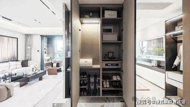以至连大部门项目不配备的冰箱也是交付尺度,还出格设置装备摆设了轨道插座、前端清水器和凉霸、吊轨金属玻璃移门,既美妙又便利清理。入户后,玄关柜也是交付尺度,不只配备了“除臭精灵”,下方更预留了扫地机械人的空间,整个精拆不只是纯真的大牌堆砌,更表现了“拎包入住”的适用性。